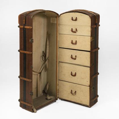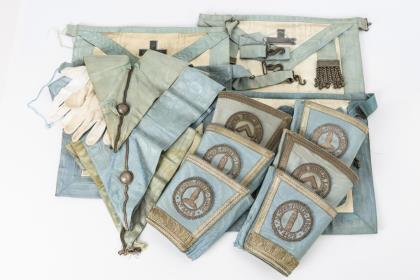 Auf den Stulpen je Applik "Semper-Fidelis-Lodge No. 4428" (Loge in Lancaster/Lancashire). Auf den 6 Stulpen je Applik der Loge mit 3 verschiedenen Symbolen. Stoffe, Metallfadenstickerei und Metallappliken teils versilbert, Ziegenleder. 4 hellblaue Stulpen, 4 Beamtenbänder in Hellblau mit Silber und Dunkelblau mit Gold, 4 Schürzen teils mit Rosetten, Tasseln und Taus. 1 Paar weiße Stoffhandschuhe, 1 Beffchen, 2 hellblaue Bijou-Bänder mit Schlangenhaken, 1 Schlangenhaken, 1 Logenapplik ohne Nr., weiße Bänder. Alters-/Gebrauchsspuren