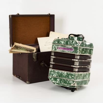 Quaderförmiger, schlichter 4-türiger Schrank auf 4 Pfeilerbeinen mit integriertem Grammophon unter Scharnier-Klappdeckel, 2 Türen für Schallöffnung mit integriertem Trichter, darunter 2-türiges Plattenfach mit Sammlung von 10 "Odeon"-Schellackplatten in originaler Mappe; Tonarm mit gemarkter Schalldose "Homocord", Ersatznadeln, Plattenteller, Geschwindigkeitsregler und Bremse, seitliche Kurbel. Gehäuse wohnfertig restauriert.
