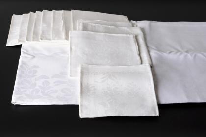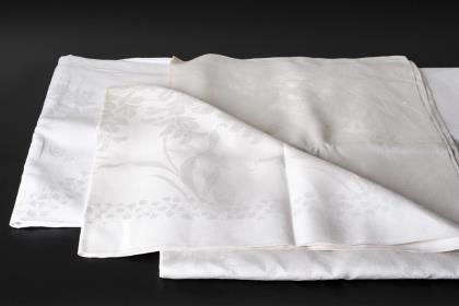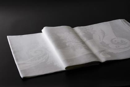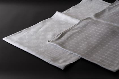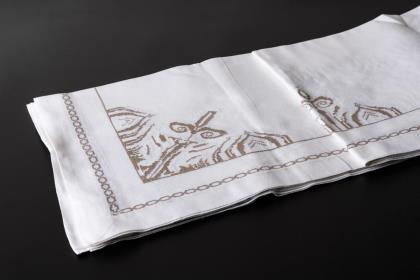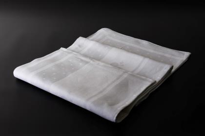 Feines Tuch mit eingewebtem Durchbruchmuster, in der Mitte als Rechteckrahmen, am Rande als breite Borde. Mongramm GL mit Freiherrenkrone