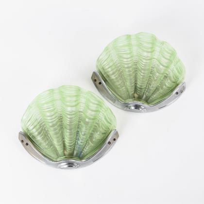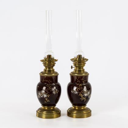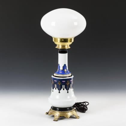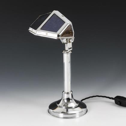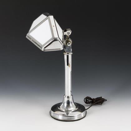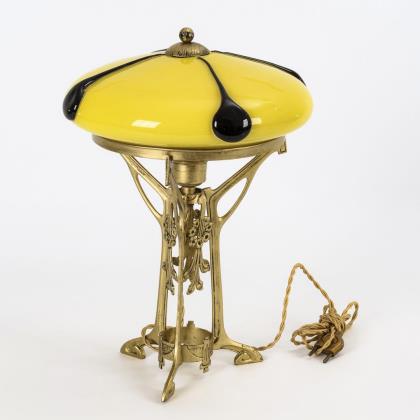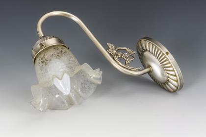 Auch als Wandlampe verwendbar. Doppelter Stabschaft und drehbarer Arm mit Gegengewicht zum Schirm mit gekniffenem Rand und floralen Auflagen bzw. Schliff. 1-flammige Schraubfassung, jünger verkabelt. Schirm eventuell in alter Art ergänzt, geringe Abplatzer am Glas.
