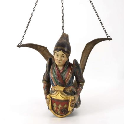 Wandhalterung in Form eines Pfeilköchers mit Adlerbekrönung, 2 Volutenarme mit den "Kerzen"
