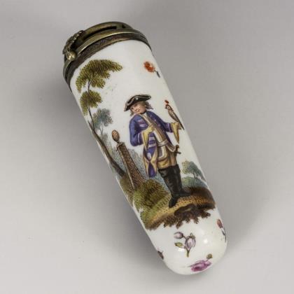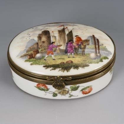 Ovale Dose mit metallmontiertem Scharnierdeckel. Auf der Deckelinnenseite und der Deckelaußenseite eine Küstenlandschaft mit Fässern, Ballen und Kaufleuten, auf der Korpusunterseite ein Blumen- und Fruchtbukett