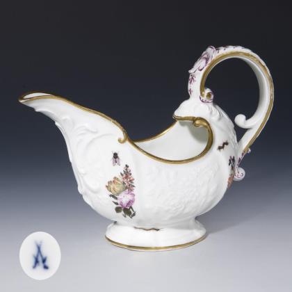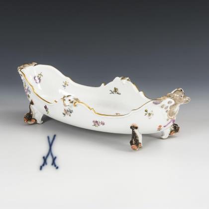 Umlaufend farbige Bemalung in Eisenrot, Emailblau, Seegrün, Purpur, Gelb und Gold. Indianische Blütenzweige mit fliegendem Phönix (Glücksvogel). Ovaler profilierter Korpus. Seitlich reliefierte, naturalistisch bemalte Löwen-Maskarons mit hochstehenden gelb-grün staffierten Schilfblatt-Handhaben. Kapuzinerbraun staffierter Rand. Unglasierter Boden, Pressmarke