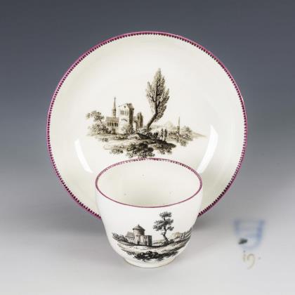 Bauchige Tasse mit Ohrenhenkel. Auf Tasse und Untertasse die Darstellung kleiner Landschaft mit reetgedeckten Häusern