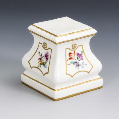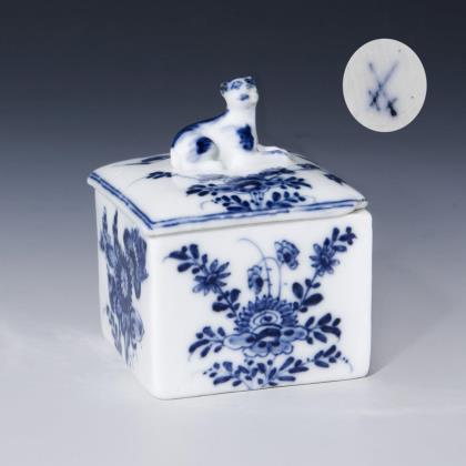 Florale kobaltblaue Unterglasurmalerei. Quadratische Form mit plastischer Deckelbekrönung. Unglasierter Boden, Schwertermarke, Formerzeichen von Paul Wildenstein (1681-1744), seit 1705 Mitarbeiter Böttgers. Sogar im Kirchenbuch als "Ältester Porcellain Fabricante" bezeichnet