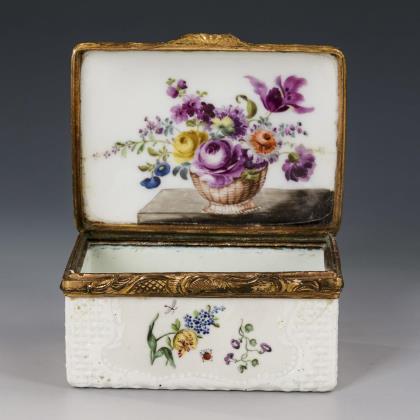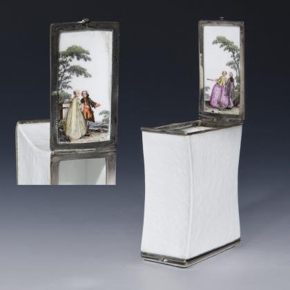 Außenwandung mit Vergißmeinnichtblüten im Flechtrelief. Innendeckel mit farbiger Bemalung "Galante Paare in Landschaft". Geschweifte Rechteckform mit horizontaler Trennwand in der Mitte. Beidseits Scharnierdeckel, Silber-Montierungen. Ohne Marke