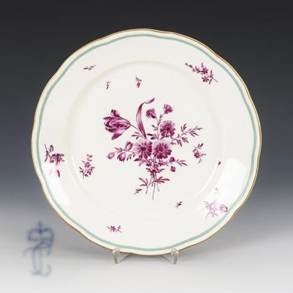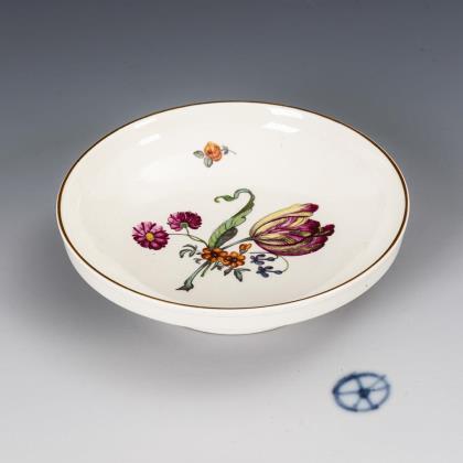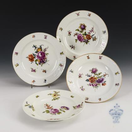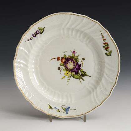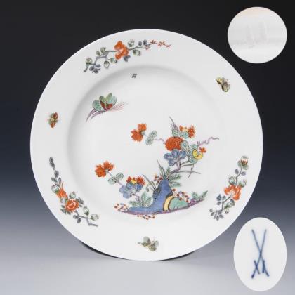 Farbige Bemalung in Eisenrot, Emailblau, Seegrün, Purpur und Gelb. Indianische Blütenzweige mit Felsen und Schmetterlingen. Schwertermarke, Formerzeichen von Johann Gottlieb Geithner (Geidner) Senior, 1707 Pirna - 1761 Meißen