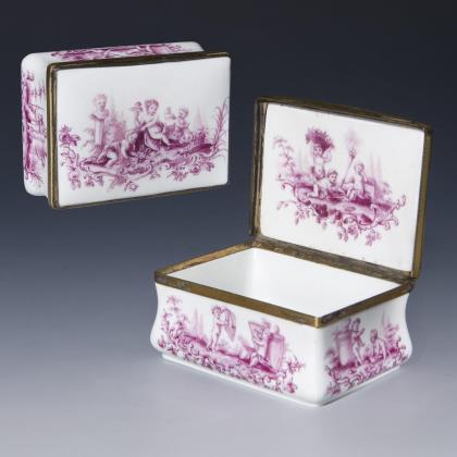 Auf allen Außenflächen und im Deckel sehr feine Purpur-Camaieumalerei mit sieben verschiedenen Szenen "Spielende Amoretten in Landschaft" in der Art von Francois Boucher (1703-1770) über Rocaillen-Konsolen mit Blütenzweigen. Restvergoldete Silber-Montierung mit Scharnier. Ohne Marke