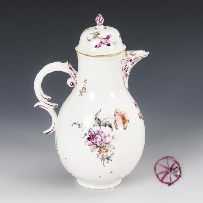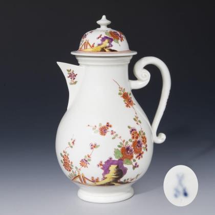 Reiche farbige Blumenbemalung mit Buketts, Einzelblüten und Festons, gold staffiert. Balusterkorpus, kleine Flachdeckel mit plastischem Blütenknauf. Henkel und Ausgüsse mit reliefierten Ansätzen. Schwertermarken