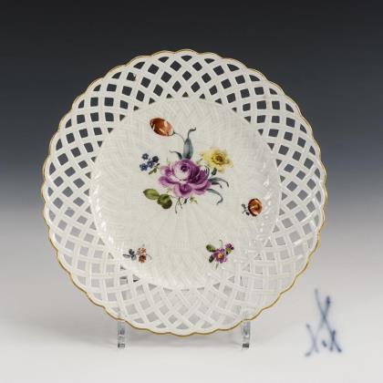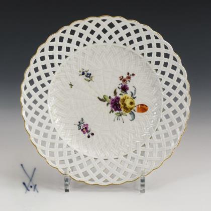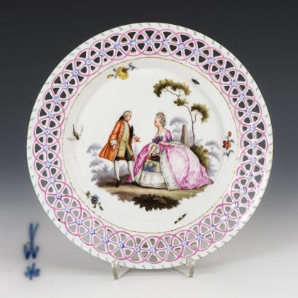 Teller mit durchbrochener Fahne. Im Spiegel die Darstellung eines galanten Paares in einer Parklandschaft
