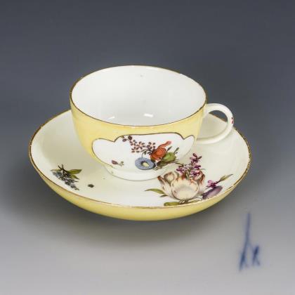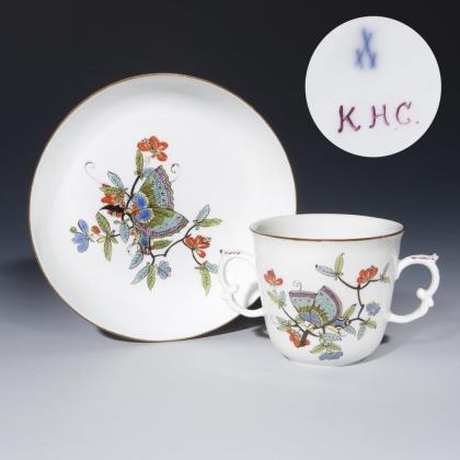 Auf der Untertasse und beidseits auf der Tasse farbige Bemalung in Eisenrot, Emailblau, Seegrün, Purpur und Gelb, "Schmetterlingsdekor". Kapuzinerbraun staffierte Ränder. Tasse mit unglasiertem Boden. Eine Schwertermarke, Pressmarke. Tasse und Untertasse mit Purpur-Monogramm K.H.C.