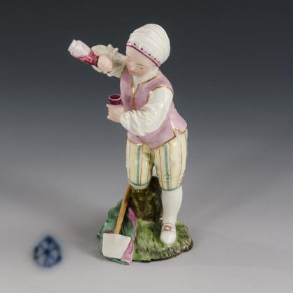 An einem Spaten stehender, sich Wein ausschenkender Gärtnerknabe