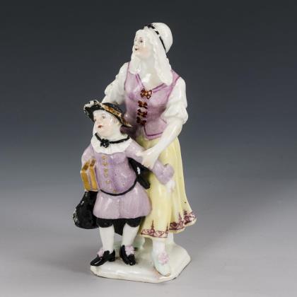 Plastik einer jungen Mutter mit Rute, den Knaben zur Schule führend