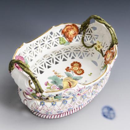 Ovaler Korb mit zwei gewundenen Henkeln, Blütenauflage und Blumenmalerei