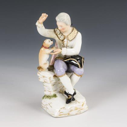 Auf einem Steinsockel sitzender, einen Hund dressierender Herr