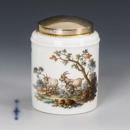 Umlaufend feine farbige Bemalung mit vier verschiedenen Hafenszenen. Beidseits große schwarz konturierte Gold-Kartuschen. Seitlich Goldspitzenbordüren. Vergoldeter Metalldeckel mit Holzkern. Unglasierter Boden, Pressmarke, Rest einer goldenen Malermarke, kaum noch erkennbare Schwertermarke