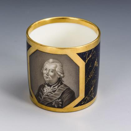 Zylindertasse mit Ohrenhenkel. Kobaltblauer Fond mit Goldmarmorierung, schauseitig eine Kartusche mit dem Grisailleporträt eines Herren. Ohne Untertasse