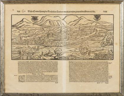 BRAUN, GEORG / HOGENBERG, FRANS, Plan der belgischen Stadt Tienen Kupferstich. Platte: 33,8 x 42 cm, Blatt: 40 x 52,7 cm. Stadtplan von Tienen (frz. Tirlemont), mit Rollwerkkartusche und Legende, verso Beschreibung in Latein; aus: "Civitates Orbis Terrarum", 1572 - 1618. Bugfalte, griff- und knickspurig. Das zwischen 1572 und 1618 in 6 Bänden erschienene Druckwerk "Civitates Orbis Terrarum" (Städte der Welt) stellt über 600 wirklichkeitsnahe Stadtansichten und Stadtpläne aus Europa, Afrika, Asien und Amerika dar.