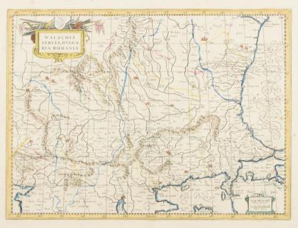 BLAEU, Willem Janszoon (1571 Alkmaar - 1638 Amsterdam) Landkarte von Teilen Südost-Europas Kolorierter Kupferstich. Platte: 34,5 46,5 cm, Blatt: 54 x 64 cm. Gerahmt & hinter Glas: 64,5 x 74,5 cm. Detailreiche Karte von Regionen in Rumänien, Serbien und Bulgarien, mit Titelkartusche "Walachia, Servia, Bvlgaria, Romania", aus "Theatrum Orbis Terrarum", 1645. Bugfalte, Randbereich stockfleckig. Niederländischer Kartograf, Kupferstecher und Verleger. Der 11-bändige, durch die Blaeu-Familie erschienene "Atlas Maior" gehörte zu den teuersten und aufwendigsten Atlanten des 17. Jh.
