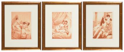 SCHULTHEIß, Karl M.(1852 München - 1944 München) Mappe: "Nachkommenschaften von Adalbert Stifter" 10 Radierungen auf Bütten. Je mit Bleistiftsignatur. Mappe: 28,5 x 21,5 cm. 10 Radierungen in originaler Mappe mit eingeklebtem Ex Libris "Dr. med. Adolf, Georg, Peter Büttner". Teils etwas stockfleckig und knickspurig.
