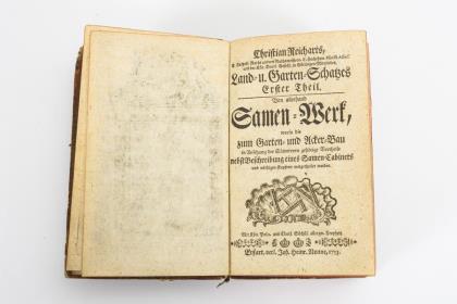 Vergleich: Christian Reicharts Land-u. Garten-Schatzes. Erster bis Vierter Theil. Erster Theil: Von allerhand Samen-Werk, worin die zum Garten-und Acker-Bau in Ansehung der Sämereyen gehörige Vortheile nebst Beschreibung eines Samen-Cabinets. Zweyter Theil: Von der Baumzucht, worin die Erziehung und Wartung so wol einheimischer als Orangen-Bäume nach allen Vortheilen aufrichtig beschrieben. Dritter Theil: Von den zur Speise dienlichen Kohlen, Wurzeln, und Zwiebeln, deren Erziehung und Wartung. Vierter Theil: Worinnen von Küchen-Specerey- und Arneyen-Gewächsen gehandelt und deren Erziehung, Wartung und Erhaltung.