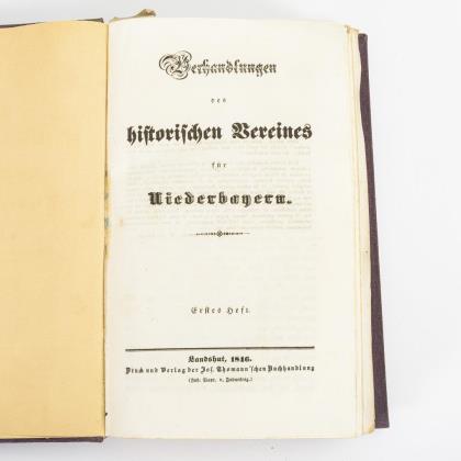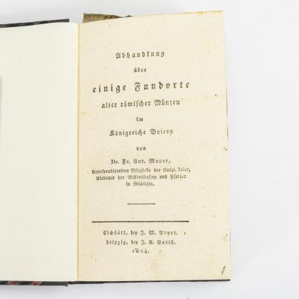 "Abhandlung über einige Fundorte alter römischer Münzen im Königreich Bayern", 102 Seiten. / "Abhandlung über einige altdeutsche Grabhügel im Fürstenthume Eichstätt", 96 Seiten, 4 Tafeln. / "Ein paar Worte über ein paar Druidenbäume im Königreich Baiern", 53 Seiten und 1 Tafel. / "Abhandlung über den Grabhügel eines altdeutschen Druiden im Fürstenthume Eichstätt", 48 Seiten und eine Tafel. Wohl jünger nachgebunden
