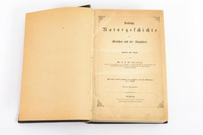 REICHENBACH, A.B. "Praktische Naturgeschichte des Menschen und der Säugethiere" Verlag von Louis Zander. Leipzig. Neue Ausgabe (1847). 28 x 19 cm. 807, 92 Tafeln mit kolorierten Stichen, wohl vollständig. Halbledereinband. Gebrauchsspuren.
