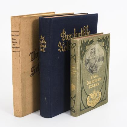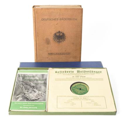HEINROTH, Oskar "Gefiederte Meistersänger" Buch + 3 Schallplatten "Das zweite tönende Vogelbestimmungsbuch". Hugo Bermühler Verlag. Berlin-Lichterfelde. Wohl 30er Jahre 20. Jh. Kassette 27 x 31 cm. Originalkassette mit Buch und 3 Schellackplatten. Altersgemäße Gebrauchsspuren. "Deutsches Bäderbuch" Verlag von J.J. Weber. Leipzig. 1907. 30 x 23 cm. Umfassendes Werk mit chemischen Analysen der Wasserzusammensetzung sowie anderer Gesichtspunkte der Heilquellen, Bäder und Luftkurorte. Widmungsexemplar mit handschriftlichen Unterschriften der Autoren für Dr. Köhler. 104, 535 Seiten und 2 Karten und 7 farbige Tafeln. Im geprägten Ledereinband und schwarz-weiß-rotem Lesebändchen. Leichte Altersspuren.