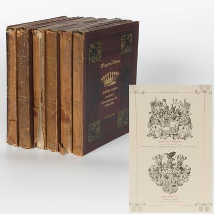 Alben mit 1200 Holzstich-Wappen auf 600 Tafeln. Jedes Wappen ist mit dem gräflichen Namen, mehrzeiliger Legende und Anweisung für die Farben versehen. Herausgegeben von M. Gritzner und Ad. M. Hildebrandt. Mappen mit Lederrücken und Goldprägung