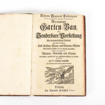 ELSHOLZEN, Johann Sigmund "Neu angelegter Garten-Bau" "Oder sonderbare Vorstellung Wie ein wohlerfahrener Gärtner nicht allein die schönsten Luft-Küchen-Baum- und Blumen-Gärten Auf unserm teutschen climate füglich anzurichten, Sondern auch allerhand rare Blumen, Gewächse und Bäume zu erziehen, warten und vor zustossenden schäden. Verlegt bei Thomas Fritschen. Leipzig. 1715. 34 x 22 cm. "In VI Büchern verfasst und in diesem vierten Druck ziemlich vermehret." Alle Bücher in einem Band. Titelblatt, (2), 258, (14) Seiten mit 10 ganzseitige Abbildungen und 4 kleine Abbildungen im Text. Komplettes Exemplar, im Ganzledereinband, Rotschnitt. Nur Einband mit etwas Wurmfraßspuren.