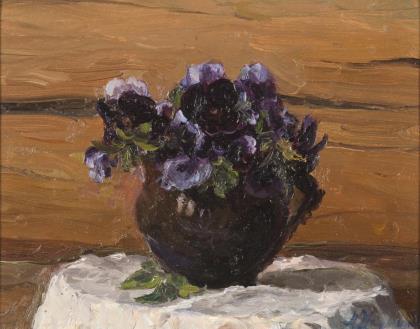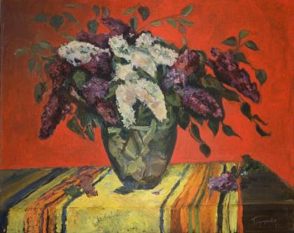 Üppiger Fliederstrauß in dezenter Vase auf einem farbenfrohen Tuch vor leuchtendem Hintergrund. Rückseitig kyrillisch bezeichnet, kyrillischer Stempel und Klebezettel. Ohne Rahmen