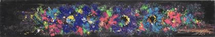 Expressiv und farbenfroh gemalter Blumenstrauß in blauer Vase.