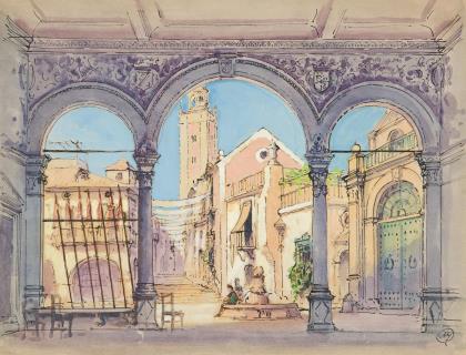 Entwurf für ein Bühnenbild in hellem Kolorit. Aquarell und Gouache über Federzeichnung. Rückseitig roter Monogramm-Stempel. Ohne Rahmen
