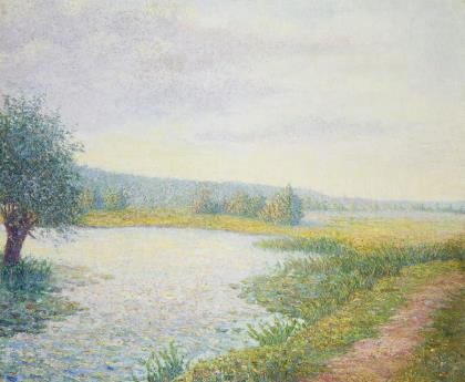 Feine Malerei in pointillistischer Manier mit zartem pastellfarbenem Kolorit. Rückseitig kyrillische Klebezettel. Neuwertiger Profilrahmen mit Leinenbezug