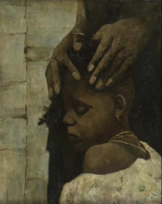 WEBER, Max: Die schützenden Hände. Öl/Leinwand, links oben signiert 51 x 42 cm, schwarz-silberner Rahmen 68 x 57 cm. Bildnis eines afrikanischen Kleinkindes mit den Händen der Mutter auf dem Kopf. ■ Polnischer Maler (1881 Bialystok/Polen - 1961 Great Neck/New York). ■ Thieme/Becker