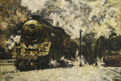 Indistinctly signed: Two steam locomotives.