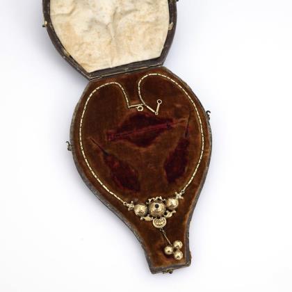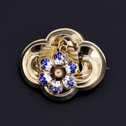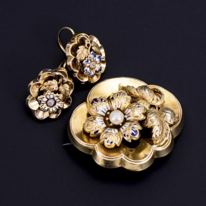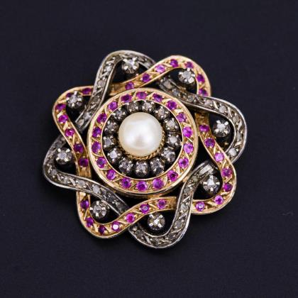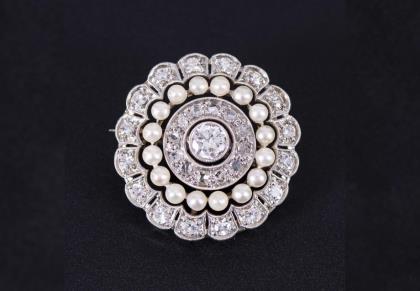 Zahlreiche kleine Diamantrosen und Flussperlchen. 1 Altschliff-Brillant circa 0.25 ct. Ohne Punzen, Feingehalt mit Säure geprüft