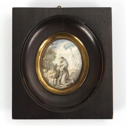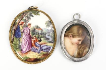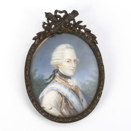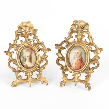 Pair of porcelain portrait miniatures with carved frames in rococo style.