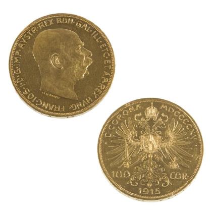 Österreich 1915. Kaiser Franz Joseph I. Münzrand mit der lateinischen Inschrift: Vnitis Viribvs (mit vereinten Kräften), das persönliche Motto des Kaisers. Die prächtige Anlage-Münze wurde in Nachprägungen bis 1988 hergestellt