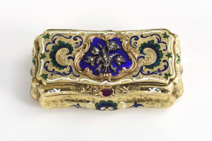 Allseits sehr fein floral graviert, farbig emailliert. Im Deckel eingesetzte Relief-Kartusche mit appliziertem Silber-Blütenzweig und Diamantbesatz. Reliefierter Drücker mit Rubin- und Diamantbesatz. Allseits geschweifte Barock-Form mit bündig schließendem Scharnierdeckel. Punzen: Feingehalt, I 2, Beschauzeichen