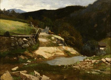 HARVENG, Carl Friedrich (1832 Frankfurt - 1874 ibid.). Mountainous landscape with brook.