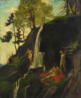HEMPFING, Wilhelm(1889 Schönau - 1948 Karlsruhe) Badende Frauen am Wasserfall Öl/Leinwand. Rechts unten signiert. 70 x 59,5 cm. Gerahmt : 80 x 69 cm. Drei nackte Frauen mit einem Hund an einem kleinen Wasserfall in den Bergen. Maler und Grafiker, studierte an der Akademie Karlsruhe, Meisterschüler Fehrs. Literatur : Thieme/Becker.
