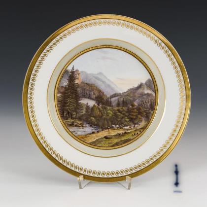 Teller mit goldgemalter Mäanderbordüre. Im Spiegel die Darstellung einer Gebirgslandschaft mit Bauern mit Kühen und Wagen an einer Furt