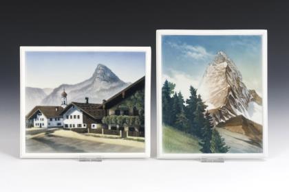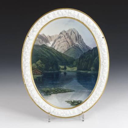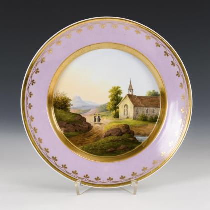 Teller mit rosafarbener Fahne und floraler Goldbordüre. Im Spiegel die Darstellung einer Alpenlandschaft mit Kirche und Figurenstaffage