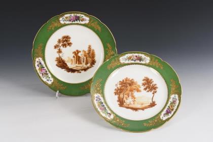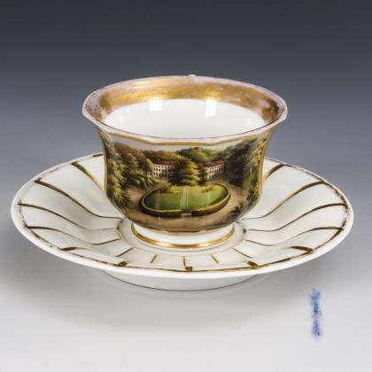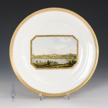 Im Spiegel des Tellers eine Landschaftsansicht mit Blick auf die Meierei von Camillo Graf Marcolini, unterseitig bezeichnet "Vue de la Métairie de Son Excellence Monsieur la Comte de Marcolini"