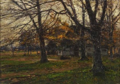 HERMANNS, Heinrich(1862 Düsseldorf - 1942) Landschaft im Herbst Öl/Leinwand. Rechts unten signiert. 34,5 x 47,5 cm. Gerahmt : 45,5 x 59 cm. Herbstliche Bäume vor einem Bauernhaus in flacher Landschaft. Eine Bestoßung mit leichtem Durchbruch. Landschafts- und Architekturmaler in Düsseldorf, studierte bei Dücker. Literatur : Thieme/Becker.