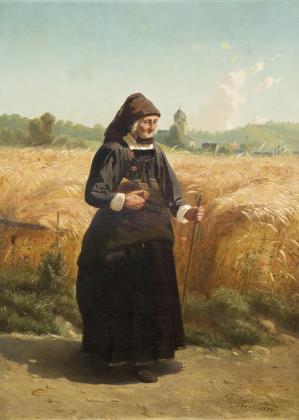 HAGEN, Theodor (1842 Düsseldorf - 1919 Weimar). Mother and child at the edge of the field.