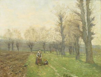 war in 101. A gekauft (Los 3755): HAGEN, Theodor (1842 Düsseldorf - 1919 Weimar) Mutter und Kind am Feldrand Öl/Leinwand. Rechts unten signiert. 24 x 32 cm. Gerahmt 35 x 43 cm. Thüringer Landschaft im Vorfrühling mit den Figuren am Ackerrand Wenige Retuschen im Himmel. Weimarer Maler, Schüler von Achenbach an der Akademie Düsseldorf, Direktor der Kunstschule Weimar. Literatur: Thieme/Becker.