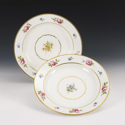 Farbige Blumenbemalung, Goldstaffage, Rosenbordüren über gepunktetem Goldfond, 12-passig geschweifter Rand. Schwertermarke mit seitlichem Punkt, Schwertermarke mit Stern
