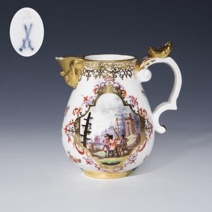Baroque milk jug with purchase journey scenes. Meissen.